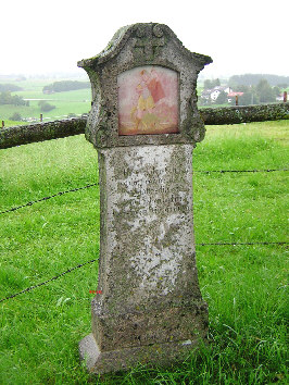 die Örtlichkeit auf der Höhe bei Aidling mit herrlichem Alpenblick und dem solitär stehenden neuen Mesnerhaus ist ein kulturhistorisch bedeutsamer Platz; bereits Siedlungsspuren um 4 000 vor Christus sind belegt; nach einer örtlichen Sage befand sich hier eine germanische Kultstätte für die Frühlingsgötting Ostara (Jac. Grimm in: Deutsche Mythologie); später errichteten hier die Römer eine Statue ihres Gottes Saturn, der Gott für Aussaat und Ackerbau; im Mittelalter erzählte man sich im Dorfe, dass von der Höhe die Hexen ausfuhren, um im Lande ihr Unwesen zu treiben; im 18. Jh. musste eine alte hölzerne Feldkapelle einem steinernen Neubau weichen, der später zur ersten Aidlinger Kirche mit Friedhof ausgebaut wurde; an dieses Gotteshaus war das alte Mesnerhaus angebaut (Mesner: Meßdiener, Haushüter); im Jahre 1749 wurde die neue Kirche St. Georg im Aidlinger Ortskern erbaut; der Bildstock bezeichnet heute die Örtlichkeit der ausgegangenen alten Kirche mit Mesnerhaus und Friedhof, auf der markanten Höhe bei Aidling (Verf.) |