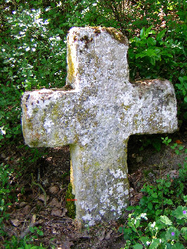Obertägige Maße: Höhe 0,92 m, Br. 0,72, T. 0,19, zeichenloses Steinkreuz lat. Form aus Muschelkalk mit geringfügigem Abschlag am Kopf |