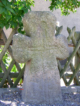Obertägige Maße: 1,25 m, Br. 0,62, T. 0,20, das Steinkreuz aus Granit mit Schafterweiterung sowie nach außen verbreiterten, gerundet abschliessenden Armen und Kopf zeigt etwa über die gesamte Fläche der Ansichtsseite ein auf der Spitze stehendes Schwert mit gerader Parierstange und rundem Knauf (Symbol des mittelalterlichen Hochgerichts); diese Kreuzform ist in gotische Epoche einzuordnen, 14.-15. Jh. (Verf.) |