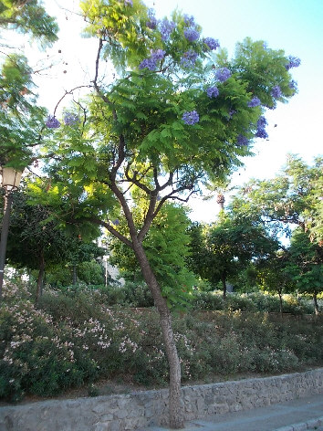 Sevilla, Andalusien, Spanien, Botanischer Garten, Jacaranda,                                   Fam. Trompetenbaumgewächse, Bignoniaceae, Heimat Mexico bis Südamerika, besonders Brasilien, glockenförmige Blüten purpur bis malvenfarbig, doppelt gefiederte Blätter