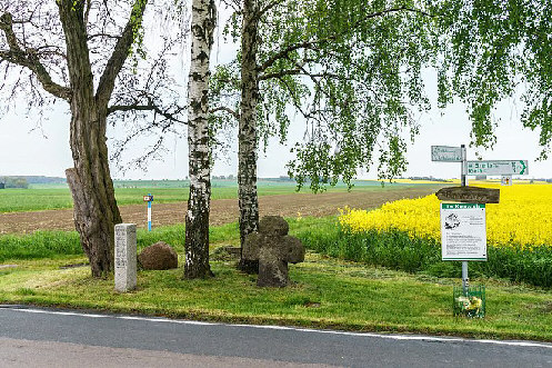 Hirschstein, OT Boritz, Lkr. Meißen, ca. 650 m nördl. vom Ortskern, westseitig an der Straße nach Schänitz (‘Schänitzer Straße’) im Nordwinkel der Feldwegkreuzung nach den letzten Anwesen (S 88 / Riesa, Einmündung ‘Zum Kreuzstein’) |