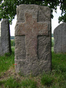 E: 1,31 m, 0,70, 0,19, das Steinkreuz mit ausgearbeiteten Winkelstützen, die einen Ring entstehen lassen, D. 0,57, besitzt keine Zeichen und weist eine restaurierte Bruchstelle im oberen Schaftbereich auf, F: 0,75 m, 0,30, 0,19, etwa die erhaltene Hälfte eines Kreuzsteines mit eingetiefter Kreisfläche, errechn. D. ca. 50 cm, die wohl ursprünglich ein herausgearbeitetes gleicharmiges Kreuz zeigte; Rest des linken Kreuzarmes erhalten; das Denkmal diente lange Zeit als Treppenstufe, G: 0,49 m, 0,85, 0,20, das Fragment könnte der Oberteil eines Kreuzsteines sein; auf der rechten Schrägfläche ein eingerilltes, kleines Linienkreuz, 19, 15 cm, H: 0,92 m, 0,52, 0,20, der durch Abschläge deformierte Kreuzstein zeigt auf der Vorderseite die Darstell. eines großen eingerillten Malteser Kreuzes, dessen rechter Kreuzarm durch Abschürfung verschwunden ist; Rückseite eingerilltes Beil mit Klotz; auf dem Kopf ein eingerilltes ‘W’ |