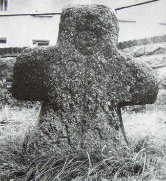Im Ort, an der Ost-West verlaufenden Dorfstraße, wo ein Weg nach Nord zu den Gehöften und zum Bach abgeht, auf einem Rasendreieck im Abzweig, nordwestlich neben einem eisernen Kruzifix. 1 Steinkreuz. Kopf und Arme zur Kreuzung zu verjüngend, Schaft nicht sichtbar, ein Arm kürzer und abgerundet. Granit. SW-NO (Ausrichtung). SO-Seite, beginnend im unteren Kopfteil, vertieft eingehauen: Dolch oder Schwert, nur runder Knauf und Griffangel sichtbar. Auf dem Scheitel des Kopfes ein Näpfchen. Höhe: NW-Seite 52 cm, SO-Seite 54 cm, Breite: 92 cm, Stärke: 27 cm. Geringe Kantenabschläge an Kopf und Armen. Tief eingesunken bis über den Armansatz. Geschützt seit 27. 10. 1971. Keine Sagen bekannt. Altbekannt. (Textkopie Lit. G. Müller-H. Quietzsch, 1977) |