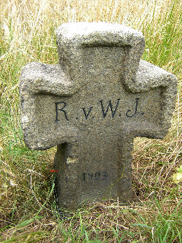 Obertägige Maße: Höhe 0,60 m, Br. 0,51, T. 0,27, das kleine gedrungene Steinkreuz aus Granit besitzt gerundete Balkenerweiterung und zeigt auf vertiefter, mit plastischen Rahmen versehenen Inschriftsfläche oben am Kopf ein linear eingehauenes lat. Kreuz, darunter über den Querbalken ‘R. v. W. J.’ sowie am Schaft ‘28. Sept. / 1903’; nach Lit. J. Naumann, 1909, wurde das Kreuz für einen mit dem Fahrrad verunglückten Knaben gesetzt (Verf. frei nach Lit. G. Müller-H. Quietzsch, 1977) |