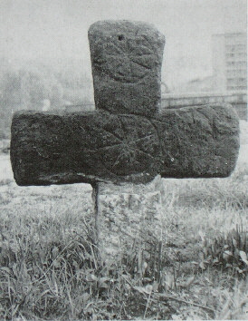 Obertägige Maße: Höhe 1,23 m, Br. 1,15, T. 0,30, Steinkreuz lat. Form aus Sandstein mit geringfügiger Balkenerweiterung, Nordseite: je an Kopf und im Kreuzungsfeld ein gleicharmiges linear eingetieftes Kreuz mit Balkenerweiterung in Kreisrillung (Spielart des griechischen Kreuzes), andere Seite vier vergleichbare Kreuze an Kopf, Kreuzungsfeld und je Kreuzarm (Verf.)