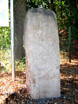 der stelenartige sog. Streitstein aus Sandstein zeigt etwa mittig in halber Höhe die eingerillte Jahreszahl ‘1600’; von seinem ursprünglichen Standort östl. der B 3, s. Hinweistafel, wurde er im September 2014 an den derzeitigen Platz mit Hinweistafel versetzt (Quelle: ...metropolnews.info), ca. 300 m nördl. lassen sich die Flurnamen (Straßenbezeichnungen) ‘Am Landberg-Am Centgericht-Am Streitstein’ nachweisen (Verf.) |