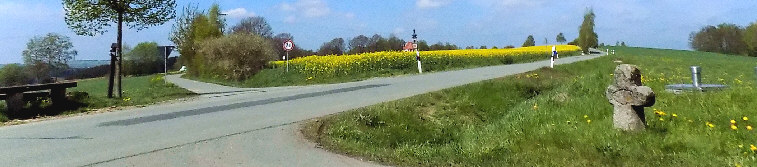 Obertägige Maße: Höhe 0,86 m, br. 0,58, T. 0,22, das Steinkreuz aus Granit mit gerundeten Enden und geringfügiger Schafterweiterung zeigt auf der Ansichtsseite die linear eingetiefte Darstellung einer nach rechts gerichteten Pflugschar (0,30); kein geschichtlicher Hintergrund ermittelbar, doch steht das Denkmal am typischen Standort eines Sühnemals - an einer Kreuzung alter Wege (Verf.) |
