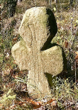 Obertägige Maße: (aktuell unbekannt), Steinkreuz lat. Form aus Granit in markant gotischer Formgebung; Ansichtsseite, vom Kopf bis in den Schaft reichende linear eingetiefte Darstellung eines auf der Spitze stehenden Säbels (oder Langmessers, Verf.); im Grunde handelt es sich bei dieser Kreuzform - Lit. G. Müller-H. Quietzsch: ‘Kopf und Arme fünfseitig geformt’ - um die stilisierte Darstellung eines mit gotischen Nasen besetzten Steinkreuzes (got. Nasen: geometrisches Element des got. Maßwerkes, z. B. got. Fenster, Bestandteil des Drei- oder Vierpasses); hierzu schreibt Berthold Schnabel in seinem Buch ‘Die Steinkreuze in Rheinhessen’, 1983, S. 129 (unter Mitarbeit von Friedrich Karl Azzola) folgendes: ‘Eine weitere Möglichkeit, die schlichte Kreuzform im Sinne der Gotik zu verändern, wurde durch die Belebung des Umrisses mit aufgesetzten Nasen erreicht, also mit einer Form, die dem Maßwerk in gotischen Fenstern entlehnt ist.’ (aus Lit. B. Losch, Die Flur-Steinkreuze in Baden-Württemberg, Leinfelden 1972, S. 28-38) (Verf.) |