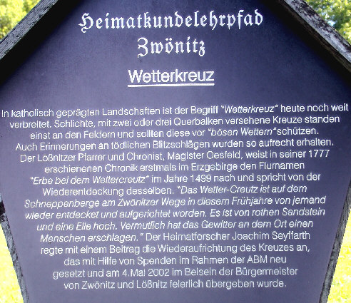 Quellangaben: Lit.: 1. Erzgebirgszweigverein Zwönitz, Hinweistafel v. Ort, Internet: 1. ...homepagemodules.de- loessnitz-wetterkreuz |