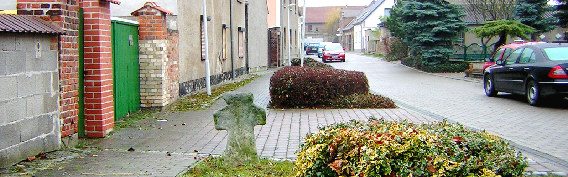 Obertägige Maße: Höhe 0,84 m, Br. 0,57, T. 0,22, das gewisse Unsymmetrie aufweisende Steinkreuz aus Sandstein (höhenversetzte Kreuzarme) wirkt im Bereich Kopf und Armoberseite zur Straße hin abgeschliffen bzw. abgewetzt, vermutlich durch das Abziehen von mittelalterlichen Hieb- oder Stichwaffen verursacht; auf dem Scheitel eine lochartige Vertiefung, die als Abriebsmal deutbar ist, s. Einf. (Verf.); am Anfang des 20. Jh. wurde das Kreuz oft von Dorfjungen mit Buchstaben und div. Zeichen bekritzelt, wovon heute nichts mehr zu sehen ist (Lit. Neumann, 1907) nach Lit. W. Saal führte hier unmittelbar am Straßenzug der alte Flutgraben vorbei; der Volksmund berichtet von einem Reiter, der hier im Sumpf einer Quelle versunken sein soll; andere Dorfbewohner erzählen von einem Brudermord, ohne jedoch genauere Angaben machen zu können (Verf.) |