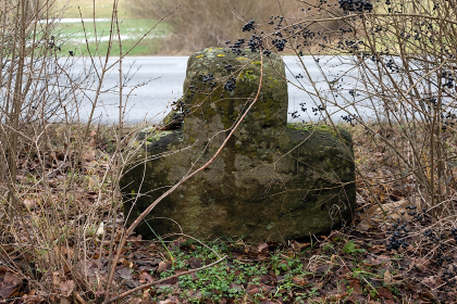 Obertägige Maße: A westl.: (aktuell nicht bekannt), durch Abschlag des Kopfes verstümmeltes Steinkreuz aus Sandstein mit gefasten Kanten, B: (aktuell nicht bekannt), durch Abbruch des Schaftes verstümmeltes Steinkreuz aus Sandstein, ursprünglich an der gegenüberliegenden Straßenseite (Verf.) |