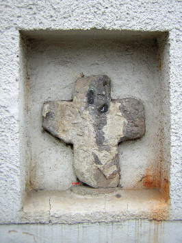 Maße: Höhe (0,57 m,) Br. 0,48, T. (sichtb. 0,08) das Steinkreuz lat. Form aus Sandstein, ebenfalls durch Abbruch verkürzter Schaft und Abschlag Unterseite Kreuzarm, wurde bei Schachtarbeiten unter dem Bürgersteig am Standort entdeckt und von Heimatforscher Gustav Adolf Spengler (Sangerh. 1869-1961) in einer Mauernische eines dortigen Gebäudes des St. Spiritus Hospitals aufgestellt; im Zuge des Straßenausbaues 1972 wurde dieses Gebäude samt einer sich östl. anschließenden Kapelle abgerissen, worauf die heutige Grundstücksmauer wenige Meter nördl. errichtet wurde; zwischen dieser Kapelle und dem Gebäude Mühlgasse 3a befand sich ein Brunnen, dessen Fragmente noch heute im Mauerwerk erkennbar sind; nach den mittelalterlichen Gegebenheiten standen beide Kreuze unmittelbar vor dem Kylischen Tor an den sich kreuzenden Altstraßen nach Süden, Artern/Erfurt, sowie nach Westen, Nordhausen und die Mühlgasse nach Norden, imgrunde ein typischer Standort von Sühnemalen; eine weitere standortspezifische Bedeutung dürfte der Beginn bzw. Endpunkt des nachstehend beschriebenen Kreuzweges erlangen; nach Lit. W. Saal handle es sich vermutlich um Grabkreuze des ehem. Friedhofes des St. Spiritus Hospitals (Verf.) |