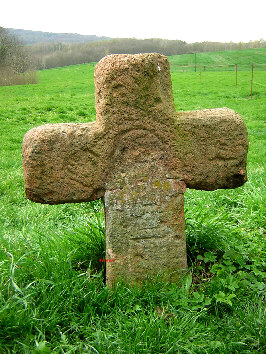 Obertägige Maße: Höhe 1,03 m, Br. 0,48, T. 0,20, das Steinkreuz lat. Form aus Porphyr mit gerundeten Enden zeigt auf der Westseite, etwa aus dem Kreuzungsfeld beginnend bis in den unteren Schaft, zwei vertikal linear eingetiefte Doppellinien, evtl. zwei bisher nicht mehr erkennbare Waffen bzw. Werkzeuge oder es handelt sich um den Rest einer ehemals größeren Darstellung (Verf.) auch aus einer Zeichnung von W. Clemens Pfau, 1894, geht nicht eindeutig hervor um welche Objekte es sich handelt; nach älterer Literatur eine Axt, Dreschflegel, Bergmannsbarte oder Beil; das Denkmal wurde 1959 von zwei Kreisdenkmalpflegern aufgerichtet und um 190° gedreht, dabei wurden unter dem Kreuz frühzeitliche Scherben gefunden; 1972 wurde das Kreuz im Zuge von Brückenbauarbeiten um zwei Meter versetzt (vermutlich nach Süden, Verf.) und dabei wieder um 180° gedreht; am Kreuz spuke ein Kalb (Verf. nach ...rochlitzer-muldental.de) |