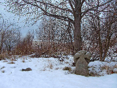 Nordwestlich vom Ort, nordöstlich an der Straße nach Ottendorf, in einem Rasendreieck eines nach Ost abgehenden Verbindungsweges zum nördlichen Ortsteil und eines nach Nord zum Diensdorfer Berg führenden Feldweges, 2 m von der Straße, 9 m südöstlich der Einmündung des Verbindungsweges. 1 Steinkreuz. Kopf, Arme und Schaft zur Kreuzung zu verjüngend, Armwinkel vollständig vertieft ausgefüllt, so daß Eindruck einer Kreisscheibe entsteht. Sandstein. WNW-OSO (Ausrichtung). SSW-Seite, im Kopf beginnend und auf den Schaft reichend, eingeritzt im Umriß: schwertartige Waffe mit sehr kurzer Parierstange. Höhe: SSW-Seite 69 cm, NNO-Seite 71 cm, Breite: 51 cm, Stärke: 25 cm. Allgemeine oberflächliche Verwitterung. Keine Gefährdung. Geschützt seit 30. 10. 1972. Altbekannt. (Textkopie Lit. G. Müller-H. Quietzsch, 1977) |