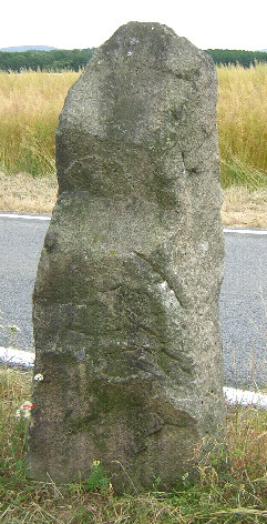 Obertägige Maße: Höhe 1,67 m, Br. u. 0,55, T. 0,40, die sich nach oben verjüngende, stelenartige, grob zugehauene Granitsäule besitzt einen unregelmäßig viereckigen Querschnitt und zeigt auf der Ansichtsseite ein flächig vertieft eingebrachtes schmalbalkiges, längsorientiertes Balkenkreuz mit Balkenerweiterung (Neigung zur Tatzenkreuzform, Verf.); rückseitig Reste einer Kreisrillung im unteren Drittel (s. Foto rechts), an dessen linken unteren Rand sich ein etwa gleicharmiges Balkenkreuz gleicher Ausfertigung befindet, mit nicht mehr lesbarer bzw. erkennbarer Beschriftung; denkmalgeschützt seit dem 29. 9. 1971; derzeit keine Sage ermittelbar; das Denkmal ist in der Literatur wenig bekannt (Verf. frei nach Lit. M. Müller-H. Quietzsch, 1977) |
