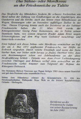 Obertägige Maße: Höhe 1,10 m, Br. 0,90, T. 0,30, das Steinkreuzfragment aus Granit (oberer Teil) befand sich bis 1983 direkt am Stamm der am 2. 5. 1871 gepflanzten Friedenseiche; unmittelbar hier am Standort des Kreuzes verlief im Mittel alter die alte Straßenführung Schleiz-Oelsnitz hinunter in die Hofaue, vorbei am Rittergut Dobeneck; damit könnte es sich um den ursprünglichen Standort des Denkmales handeln; 1983 wurde der Plauener Steinmetz Helmut Naumann mit einer Erneuerung des Kreuzes beauftragt; er fertigte einen neuen Schaft und gab dem Denkmal seine ‘neu zeitliche Form’ (Textauszug Hinweistafel); dieses offensichtlich sehr unglückliche Ergebnis führte auch zur unrichtigen Aufstellung des verbliebenen Restes, der Kopf zeigt nach links bzw. rechts (Verf.) Sage: am 31. März 1648 befand sich hier der Taltitzer Rittergutsbesitzer Georg Peter Reitzenstein auf dem Weg nach Geilsdorf als er von seinem jüngeren Bruder Adam Ernst wegen Erbstreitigkeiten meuchlings erstochen wurde