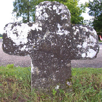 Obertägige Maße: H. 0,90 m (g. 1,45m) Br. 0,90, T. 0,28, das zeichenlose Steinkreuz aus Kalkstein mit gerundeten Enden wurde bei Baumaßnamen 1972 zur Erweiterung des Sportgeländes umgerissen, wobei der Schaft abbrach; zunächst hinter dem Vereinsheim gelagert und nach Reparatur durch den Steinmetzmeister Frey, Eislingen-Fils erfolgte im Einvernehmen mit dem damaligen Bürgermeister Bulling und unter Mithilfe einer Schülergruppe der Dr.-Engel-Realschule Eislingen, sowie Hausmeister Dannenmann, die Neuaufstellung am heutigen Platze im gleichen Jahr, etwa 40 m vom ursprünglichen Platze entfernt; im Zuge der Versetzung wurde das Kreuz in Form und Größe komplett sichtbar, s.u. (Kopie Lit. E. Wiedenmann) nach folgender Sage steht das Denkmal mit einem heute verschollenen zweiten Treffelhauser Steinkreuz in Verbindung, s.r. (Kopie Lit. E. Wiedenmann, Höhe 0,90, Br. 0,70, T. 0,26) es stand am gleichen alten Wege nach Schnittlingen, ca. 400 m weiter und wurde im Zuge der Flurbereinigung zwischen 1960-1970 unverständlicherweise zur Mülldeponie Franzosenschlucht gebracht; abweichende Erzählungen von Einwohnern beziehen sich auf die Schwedenzeit (Dreißigj. Krieg, 1618-48) nach G. Stütz, A. Birlinger, A. Wiehl trugen ein Schwede und ein Franzose einen Zweikampf aus, wobei einer getötet wurde, der andere tödlich verwundet, schleppte sich noch zwanzig Schritte weiter, wo er ebenfalls tot zusammenbrach - die Stelle des zweiten, verschollenen Kreuzes; beide Kreuze sollen seit uralter Zeit auf dem Felde zwanzig Schritt auseinander gestanden haben (Verf.) |