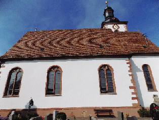 nach dem großen Dorfbrand im Zuge des Pfälzischen Erbfolgekrieges begannen 1706 die Aufräumarbeiten am zerstörten Gotteshaus, worauf 1712 die Bauarbeiten am Turm und Langhaus einsetzten; die Südseite des Langhauses einschliesslich des Sockels musste gänzlich neu errichtet werden, dabei verwendeten die Bauleute Grabsteine des alten Friedhofes aus dem 17. Jh., die bei der letzten Außensanierung freigelegt und damit wieder sichtbar wurden (Verf.) |