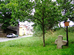 Obertägige Maße: Höhe 0,90 m, Br. 0,78, T. 0,18, das Steinkreuz aus Granit mit gerundeten Enden weist einen durch Abschlag verkürzten Kreuzarm, sowie arge Oberflächenverwitterung auf; es ist zeichenlos, ganz in der Art der alten Sühnekreuze; auf Kopf und Armoberseiten sind näpfchenförmige Vertiefungen zu beobachten, die als Abriebsmale deutbar sind, s. Einf. (Verf.); ein zweites Steinkreuz soll hier bis zum Jahre 1886 gestanden haben, wurde aber bedauerlicherweise im Zuge des damaligen Straßenausbaues zerschlagen (Lit. Bucka-Heland) im Ort hält sich die Sage von zwei Burschen, die sich hier gegenseitig erschlugen; nach anderer sollen sich im Dreißigjährigen Krieg zwei schwedische Offiziere im Zweikampf getötet haben |