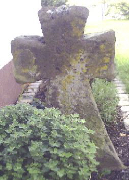 Obertägige Maße: Höhe 0,80 m, Br. 0,56, T. 0,20, Steinkreuz aus Sandstein typisch gotischer Stilepoche - breitflächig, gedrungener Kreuzstand mit Balkenverbreiterung, relativ langer Schaft, der sich markant geradlinig verbreitert; auf dem Scheitel kerbartige Eintiefung, vermutlich das Resultat des mittelalterlichen Brauchtums Hieb- oder Stichwaffen an heiligem Gestein abzuziehen bzw. Schärfen, ein Aberglaube der vermeintlichen 'Kraftübernahme', s. Einf. (Verf.) |